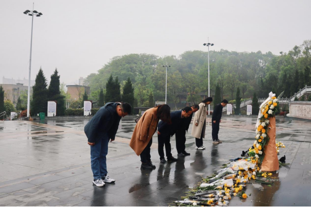 烈士纪念碑前,整齐高亢的旋律响起,中共益阳市大通湖区水利管理委员会办公室支部全体党员齐声高唱中华人民共和国国歌。紧接着,在绵绵细雨中党员们肃立在群雕前,整齐列队,低头默哀,表达对革命先烈的深切缅怀和敬仰。