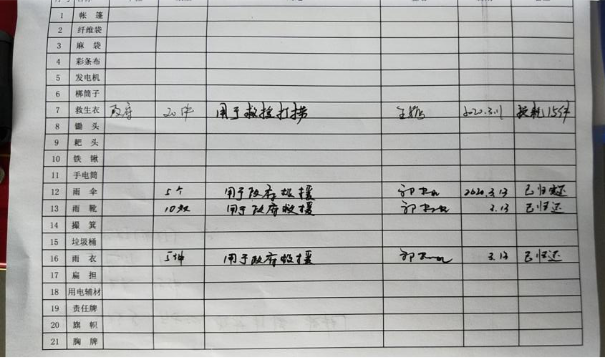 张家塞乡防汛物资管理仓库2020年进出库台账