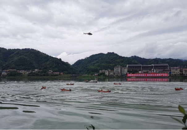 冲锋舟、直升机在资水干流营救落水群众
