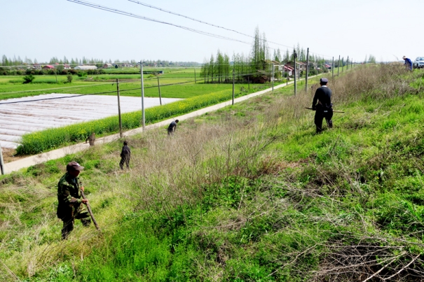 3月底至4月初,沅江市一线防洪大堤上,不时地看见十多位民工为一组,在大堤上砍草整坡,这是该市部署的大堤整容集中行动。