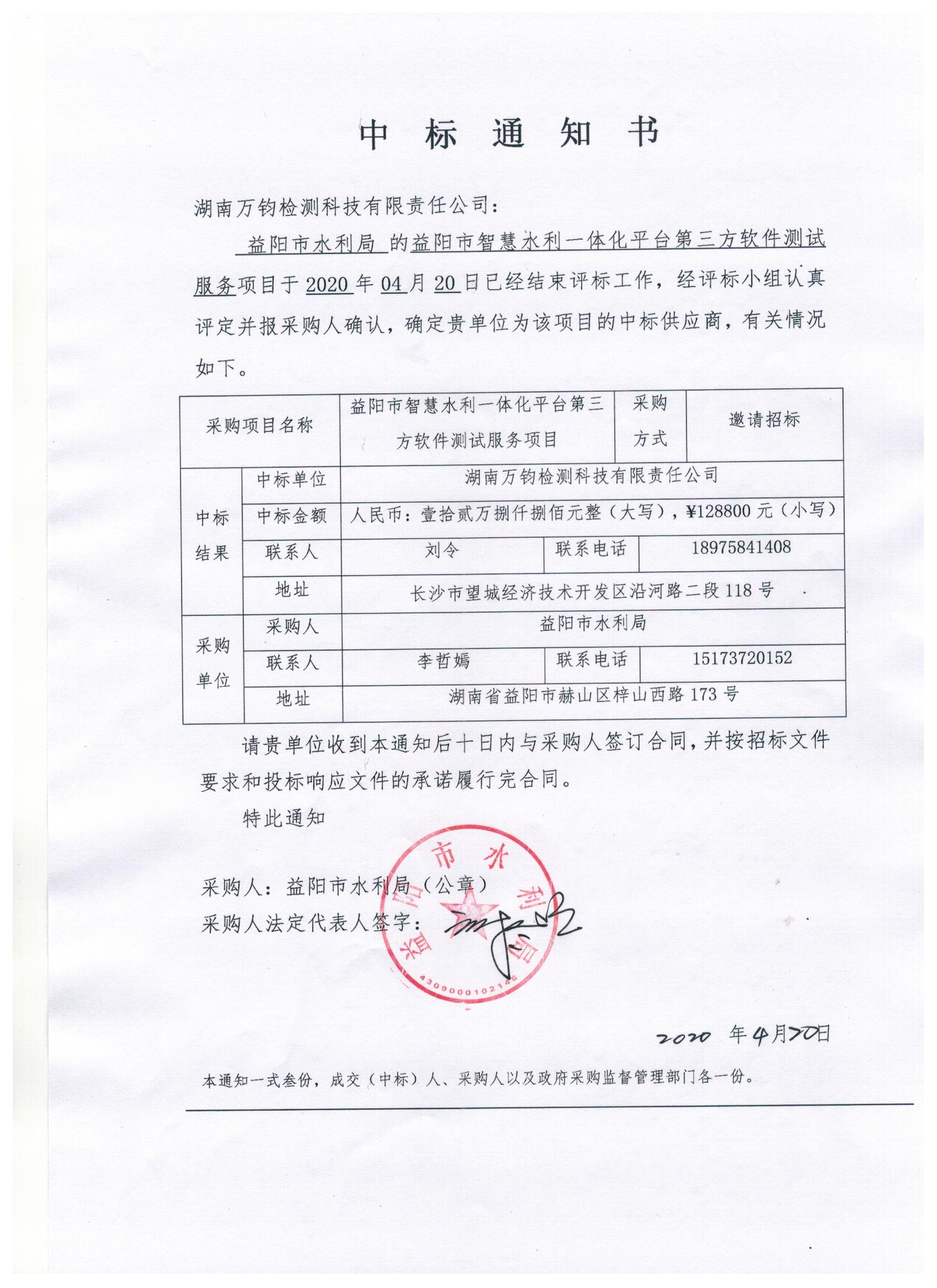 《益阳市智慧水利一体化平台第三方软件测试服务项目》中标通知书