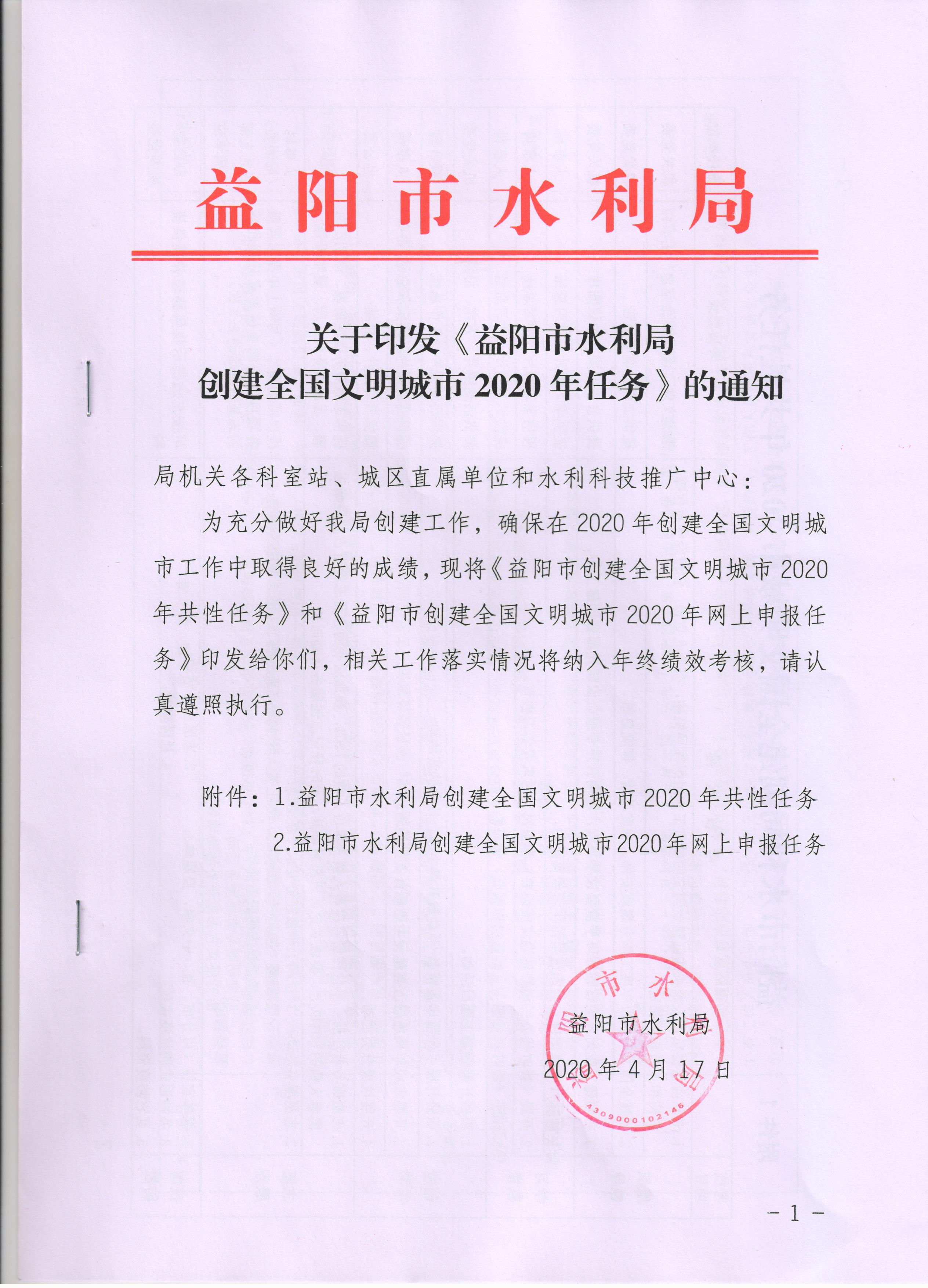 关于印发《益阳市水利局创建全国文明城市2020年任务》的通知