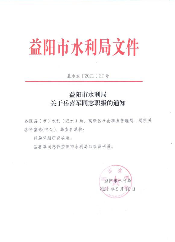 益阳市水利局关于岳喜军同志职级的通知