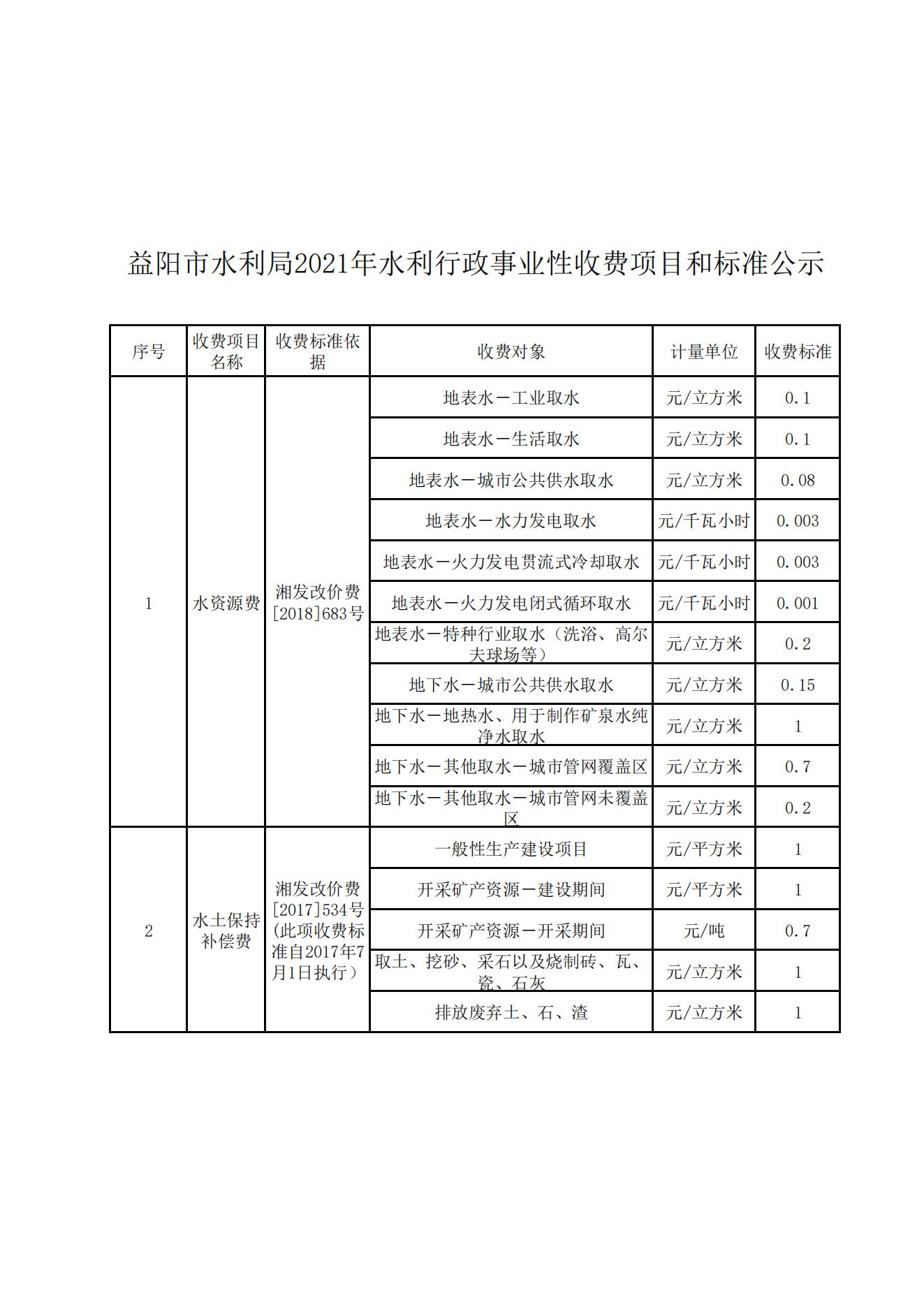益阳市水利局2021年水利行政事业性收费项目和标准公示
