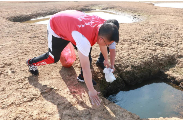 志愿者们来到滩上开展护河(湖)活动,每一位志愿者拿着夹子、垃圾袋、手套等工具,对滩上垃圾、湖边漂浮物进行捡拾打捞。
