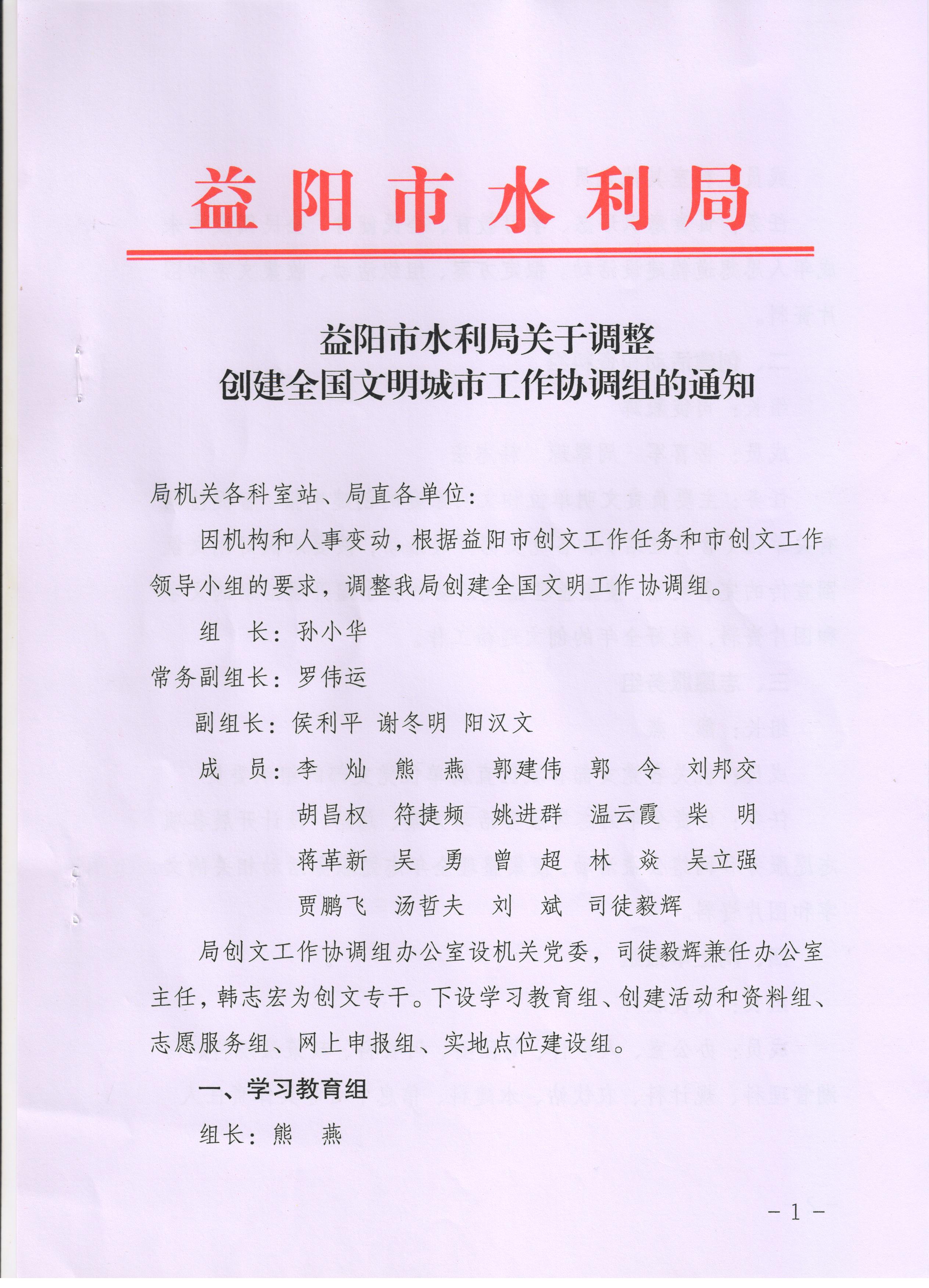 益阳市水利局关于调整创建全国文明城市工作协调组的通知