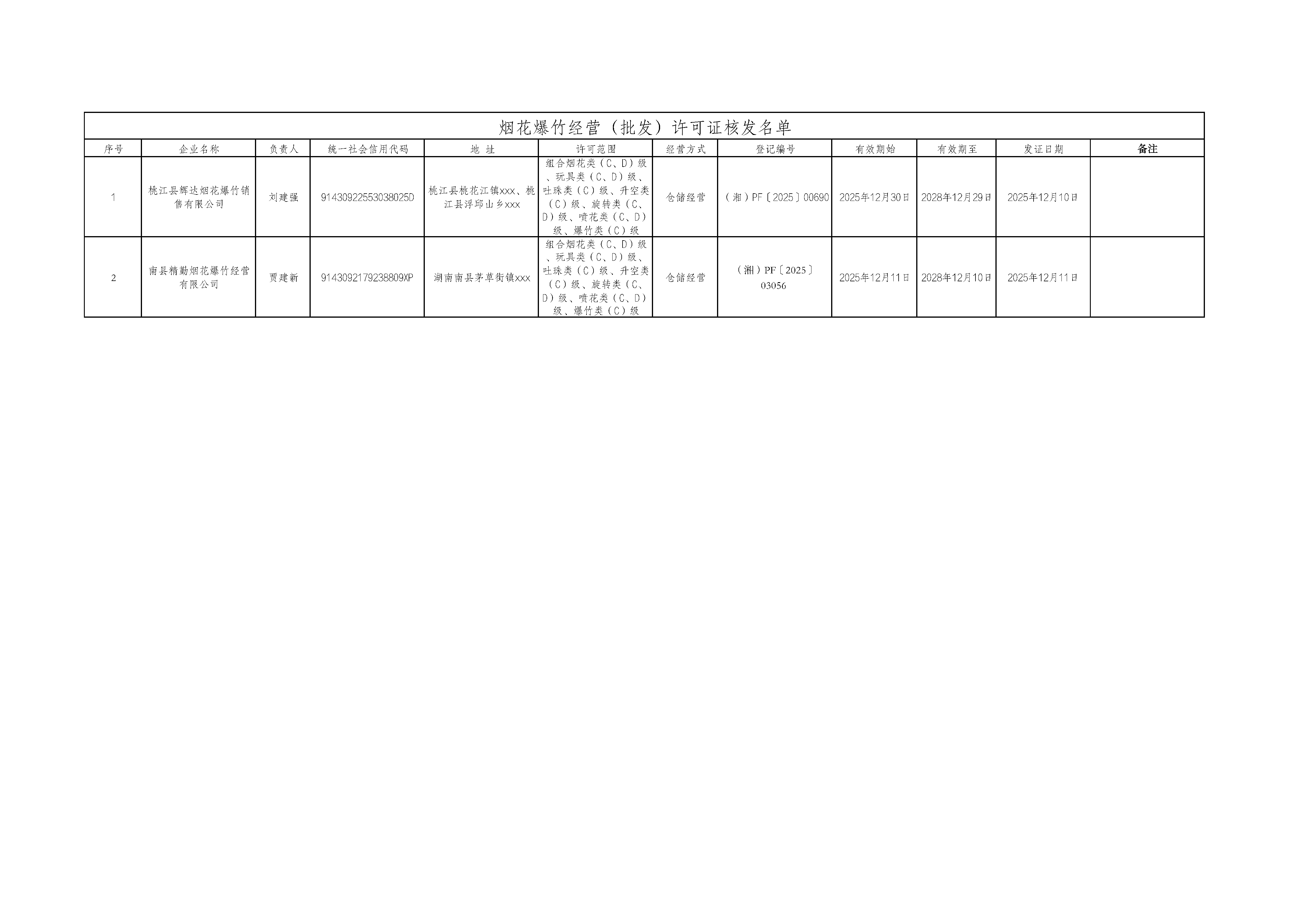 根据《烟花爆竹安全管理条例》、《烟花爆竹经营许可实施办法》等有关规定,经企业申请,2025年12月10-11日,我局依法对申请企业实施行政许可审查,经核准颁发2家企业《烟花爆竹经营(批发)许可证》,现予以公示。
