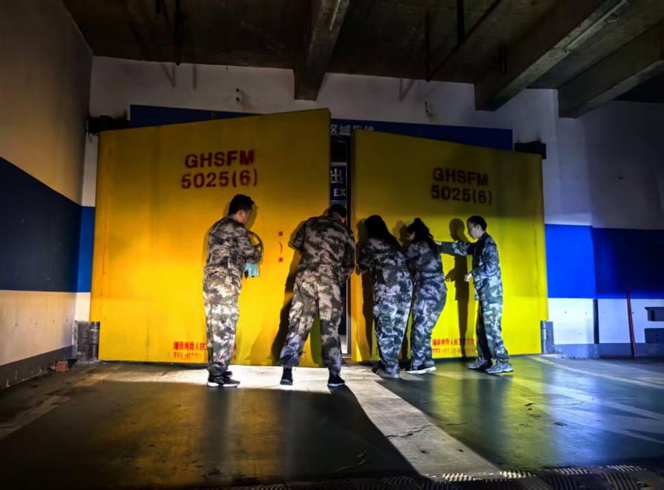市人防工程平战转换专业队依托人防结建工程开展实地人防工程防护密闭门紧急开关平战转换演练。