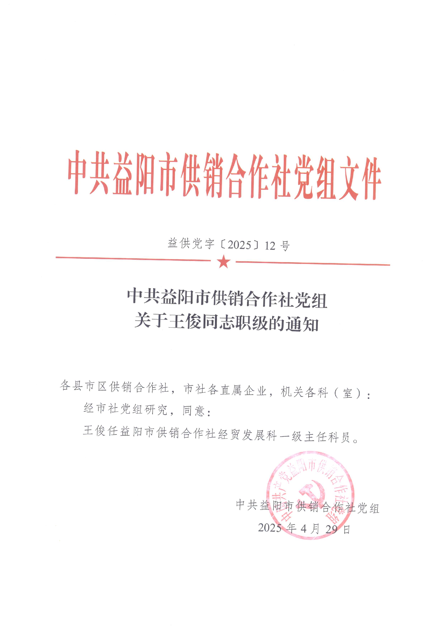 中共益阳市供销合作社党组关于王俊同志职级的通知