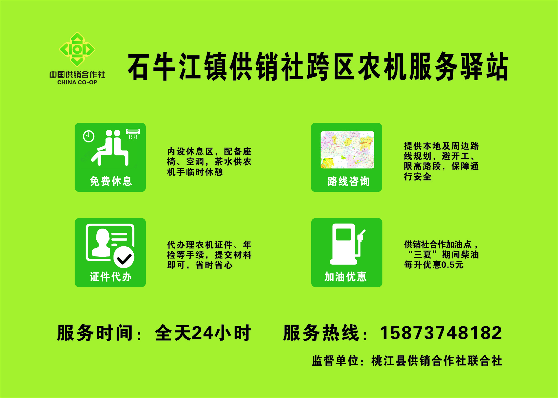 桃江县供销社依托15个基层社、60个村级服务社及县域农资配送中心,联合交通运输部门建立常态化协作机制。在桃花江镇、灰山港镇、鸬鹚渡镇、武潭镇、马迹塘镇等高速出口乡镇,精心设立跨区农机服务驿站,为过往农机手提供免费休整、路线指引、证件协办等贴心服务。“三夏”期间,累计协助12台跨区作业农机高效通过县域主要卡点,每台农机过境时间平均压缩1.5小时。同时,桃江县供销社联合交通执法人员开展农机绿色通道专项巡查,扫清跨区作业障碍,让农机跨区协作“一路畅通”。