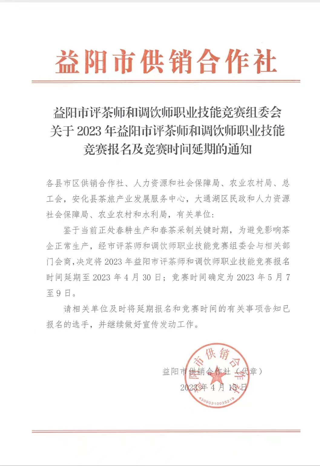 关于2023年益阳市评茶师和调饮师职业技能竞赛报名及竞赛时间延期的通知