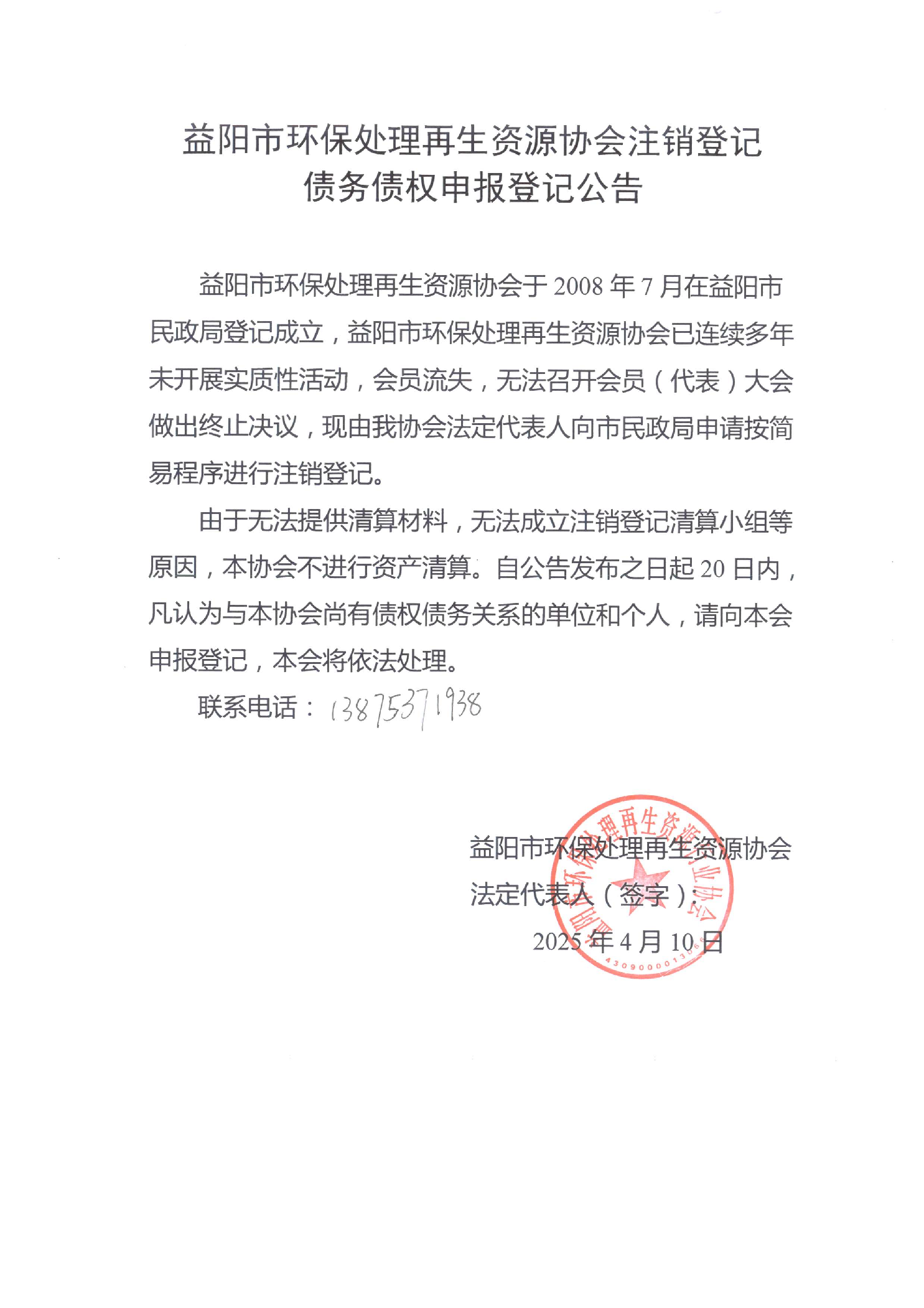 益阳市环保处理再生资源协会注销登记债务债权申报登记公告