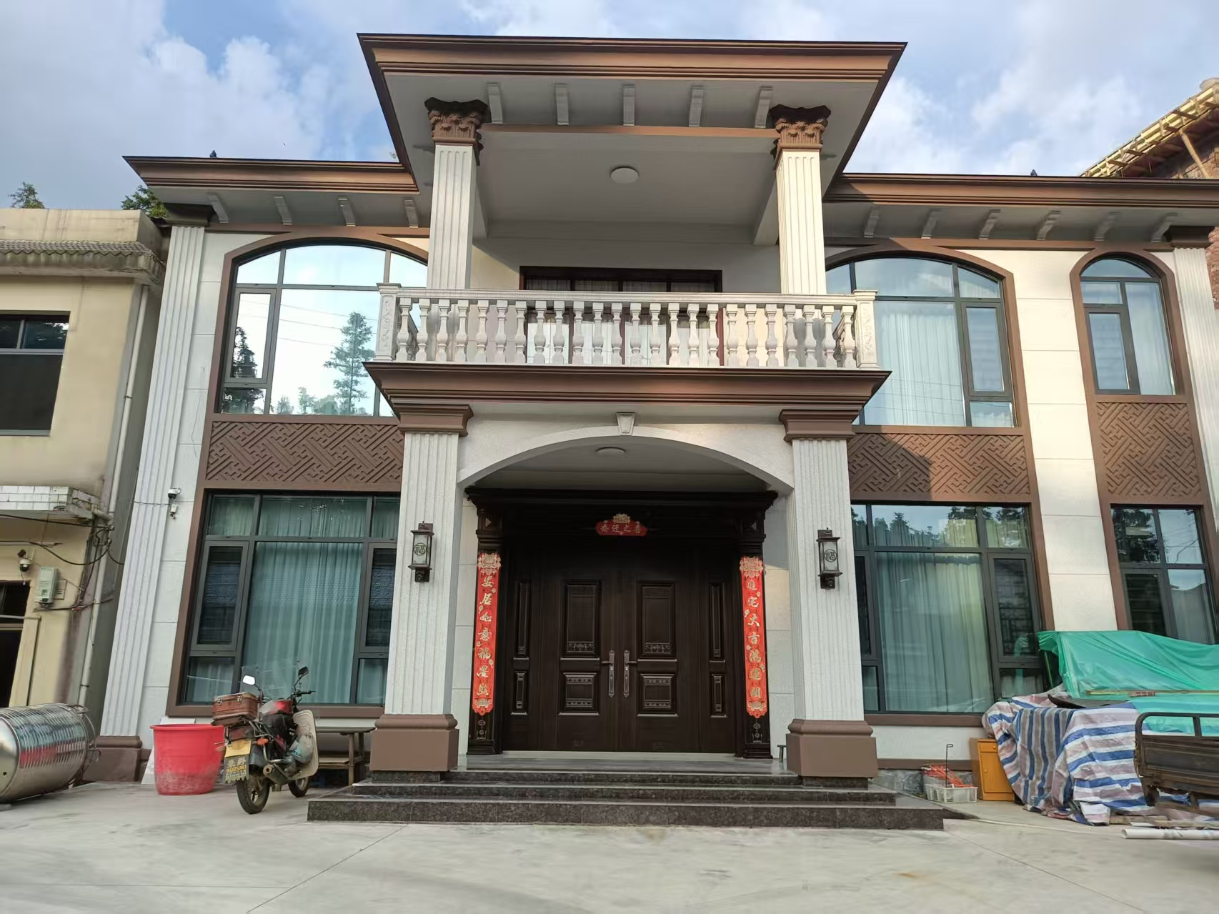 这座两层别墅的设计融合了欧式典雅与中式生活气息。外立面以米白色为主调,搭配棕色装饰线条和窗套,营造出温暖和谐的视觉效果。最具特色的是门廊处的两根罗马柱和上方白色栏杆围合的阳台,赋予建筑浓郁的欧式风情。大面积的拱形窗户不仅美观,更保证了室内充足的自然采光。施工上注重细节处理,深棕色双开实木大门与红色对联形成鲜明对比,展现出精细的做工。建筑整体比例协调,米白色外墙与棕色装饰线的搭配既庄重又不失温馨。