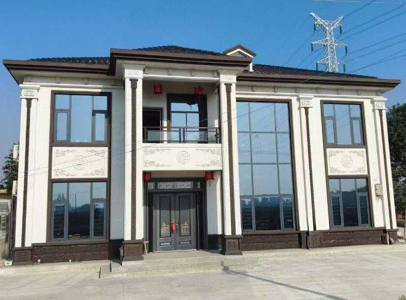 设计/施工特色:以现代简约为基底,巧妙融入传统中式建筑语言。通过门楣装饰与收分立柱等细节,在延续乡土文化质感的同时,完美契合当代居住审美。外立面采用仿石砖铺贴与线性分割造型相结合,墙面浮雕与门窗边框均呈现规整精细的工艺,充分体现了施工者“精准把控细节”的专业习惯。大尺寸玻璃门窗保障了室内采光通风,底层适度抬高的空间设计灵活满足储物、待客等乡村生活场景需求。外墙选用耐用的仿石材质和防水涂层,利用现代建筑材料增强房屋稳固性,同时控制成本适配乡村建设实际。