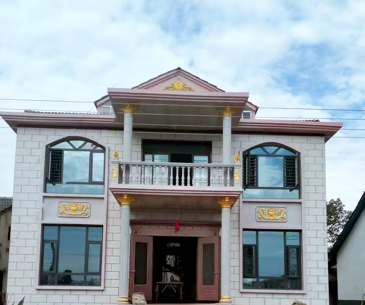 设计/施工特色:该建筑为乡村欧式混搭风格,是当前农村自建房的主流设计类型,核心特色是将经典欧式元素与本土居住审美深度融合。外立面采用罗马柱、拱形窗、雕花栏杆、三角顶檐等标志性欧式符号,立柱及装饰节点以金色描边点缀,凸显欧式建筑的精致华丽感。墙面选用仿石砖等本土化建材,搭配粉紫、米白、金色的撞色组合,营造出浓郁醒目的视觉效果。户型设计贴合农村生活需求,采用多层独栋布局。装饰细节匠心融入中式吉祥纹样浮雕,实现中西美学的巧妙碰撞。施工环节优选预制雕花构件,搭配本土化简易工艺,兼顾施工效率与成本控制,以“大气富贵”的视觉呈现,诠释了乡村自建别墅对欧式风格的本土化创新演绎。