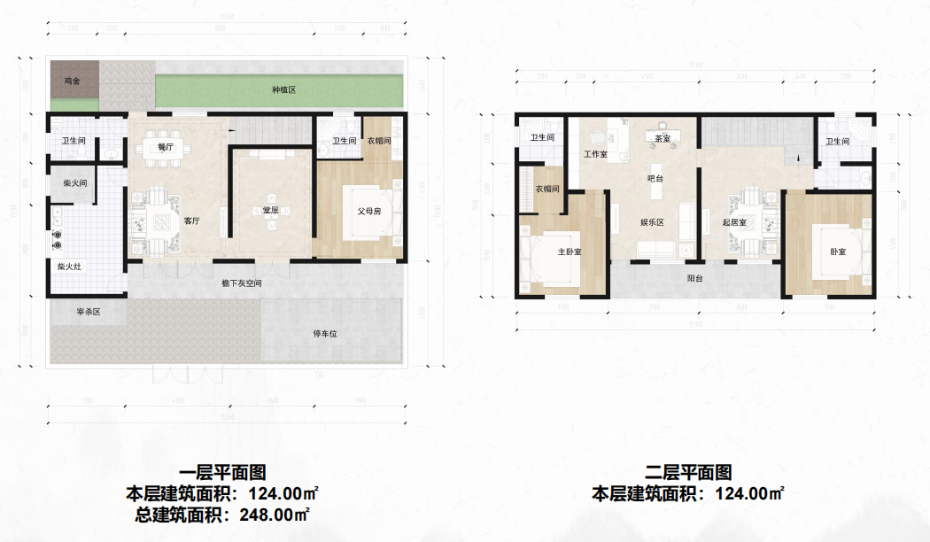 布局既包含传统的中式风格,又充满现代元素。例如:即设计了种植区、鸡舍、宰杀区和柴火灶,也设计了吧台、茶室、娱乐室等,满足不同生活场景和不同年龄段人的需求。