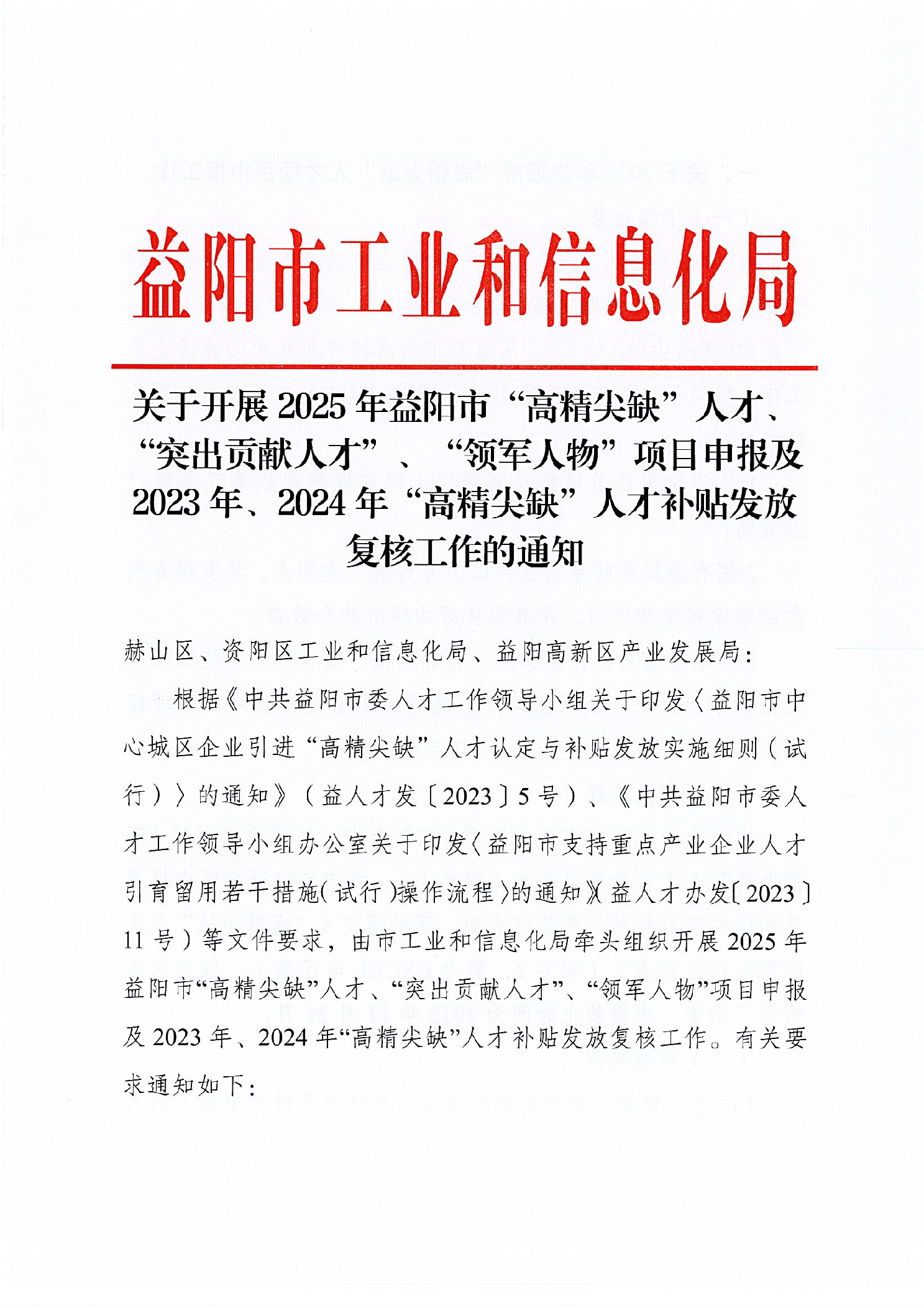 关于开展2025年益阳市“高精尖缺”人才、“突出贡献人才”、“领军人物”项目申报及2023年、2024年“高精尖缺”人才补贴发放复核工作的通知