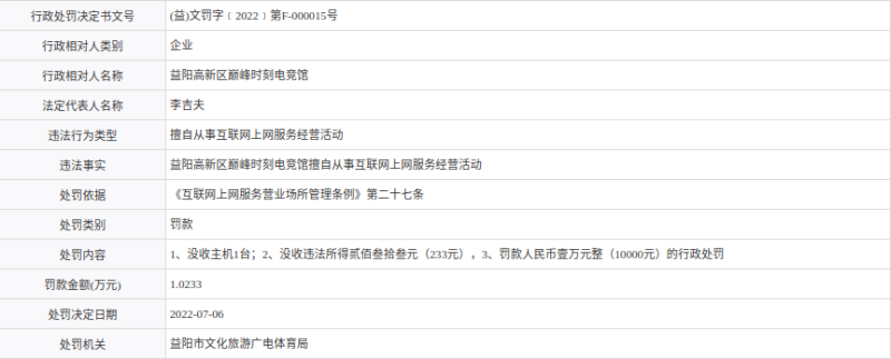 【行政处罚】益阳高新区巅峰时刻电竞馆