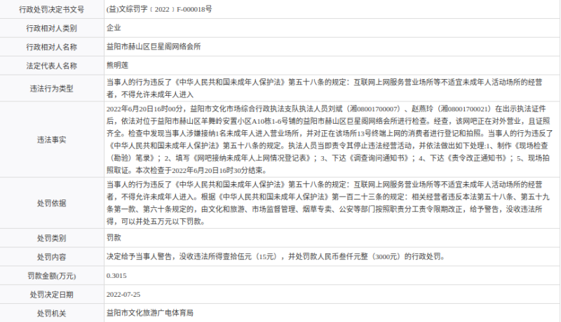 【行政处罚】益阳市赫山区巨星阁网络会所