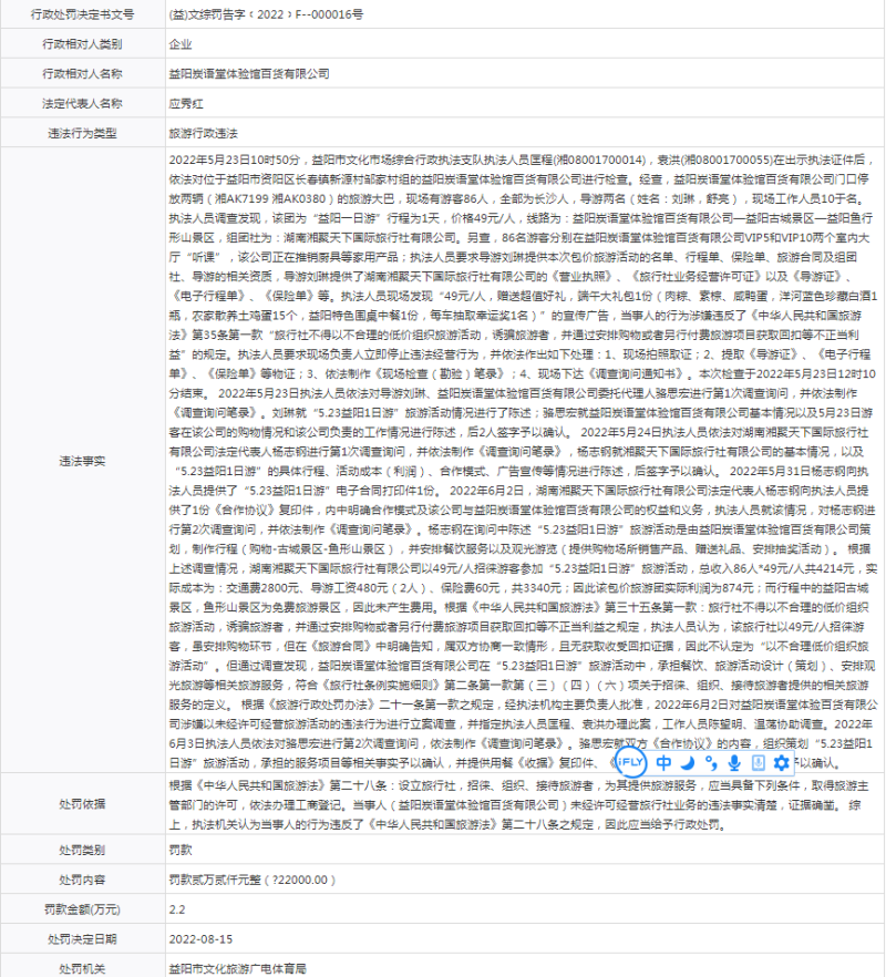 【行政处罚】益阳炭语堂体验馆百货有限公司