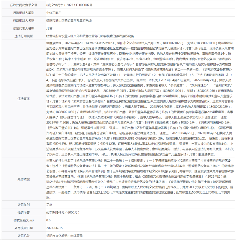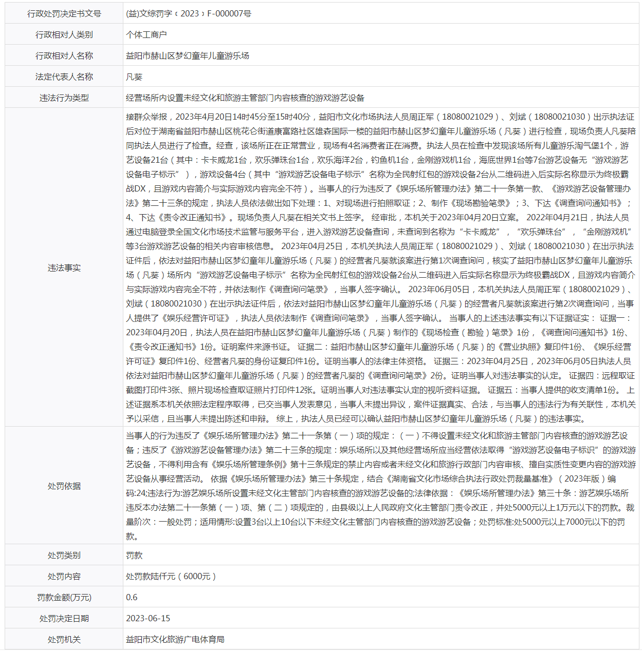 【行政处罚】益阳市赫山区梦幻童年儿童游乐场