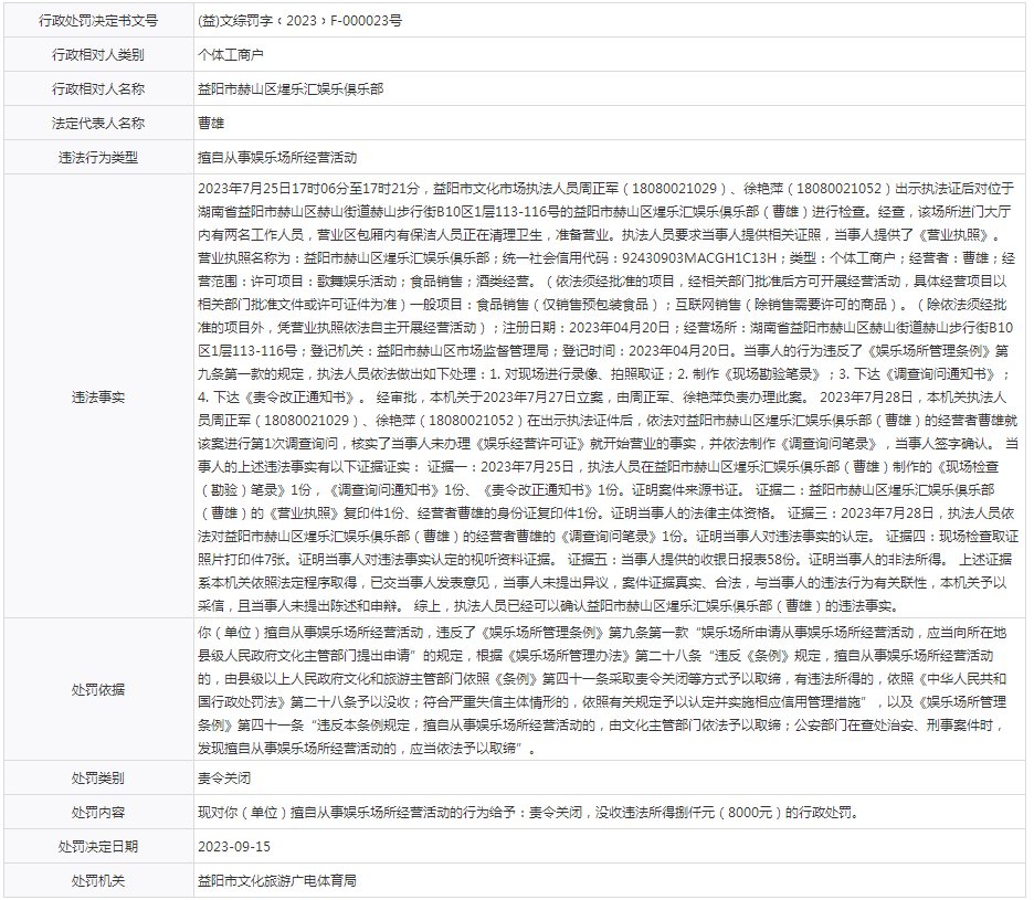 【行政处罚】益阳市赫山区煋乐汇娱乐俱乐部