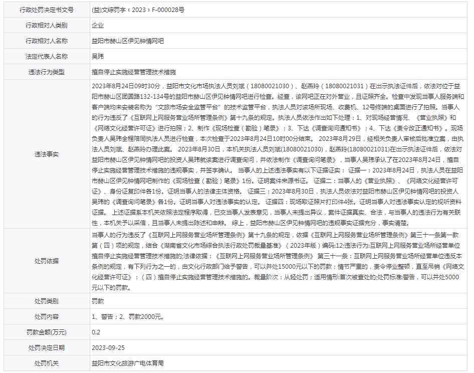 【行政处罚】益阳市赫山区伊见钟情网吧
