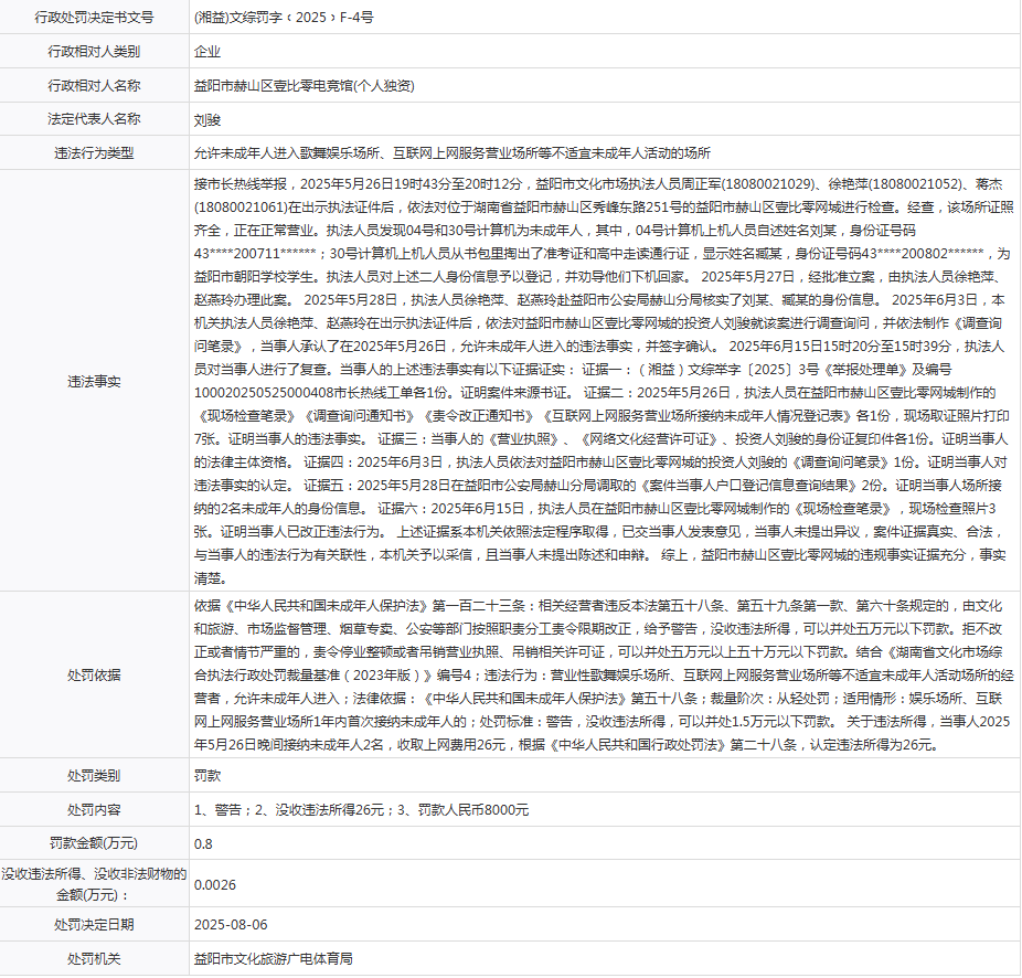 【行政处罚】益阳市赫山区壹比零电竞馆(个人独资)