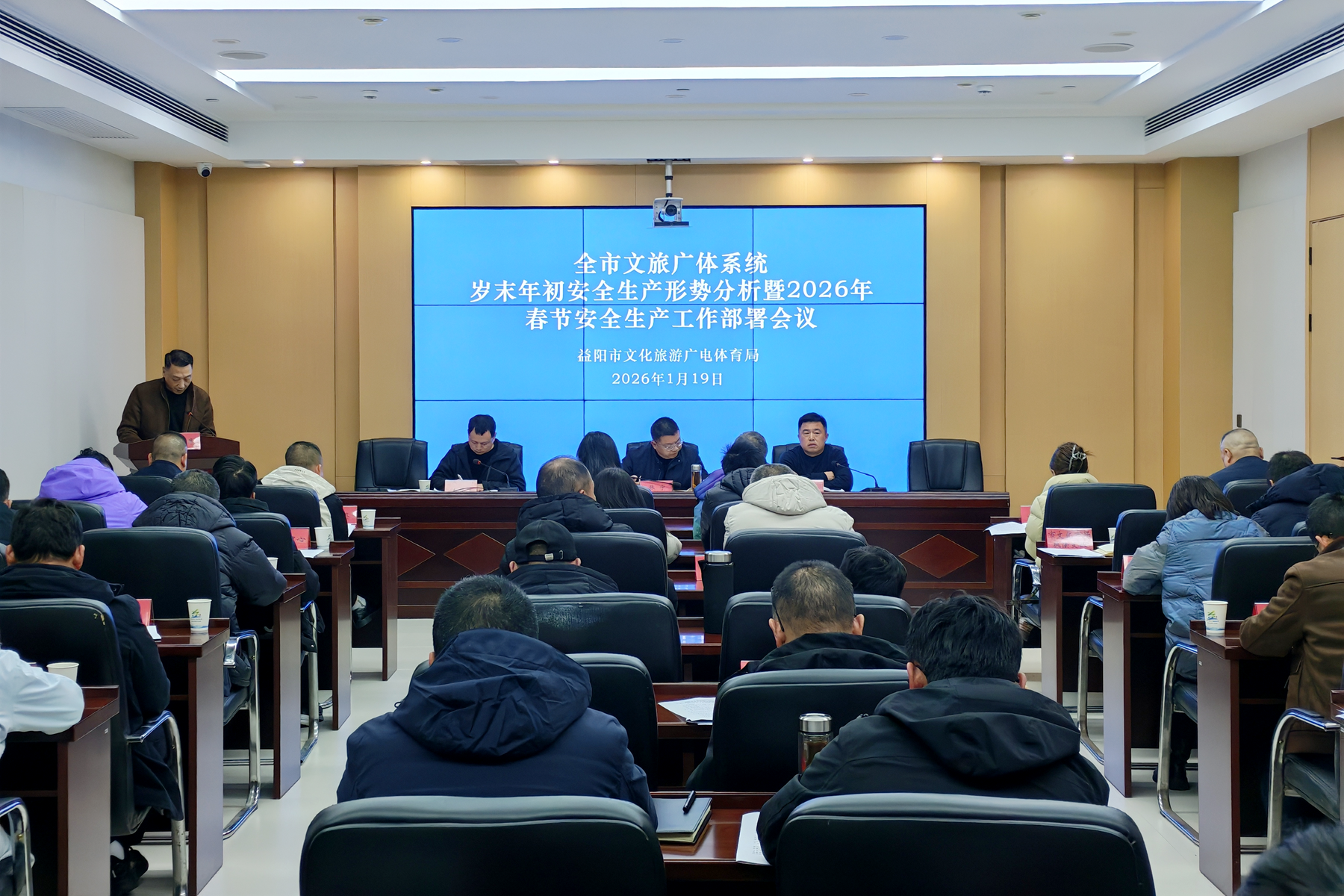 1月19日,全市文旅广体系统岁末年初安全形势分析暨2026年春节安全生产工作部署会议在市文旅广体局召开。会议由局党组成员、副局长叶思劲主持,局党组成员、副局长张宇出席会议并讲话。