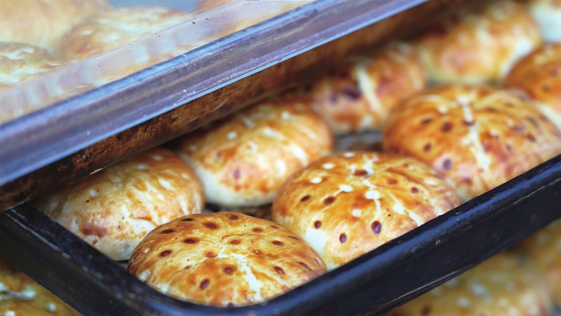 皮子的调制就很有讲究。得用上好的面粉和油调出水油皮,再包上油酥一遍遍地擀压,少说也得叠出30层,才能有出锅时的酥脆感。