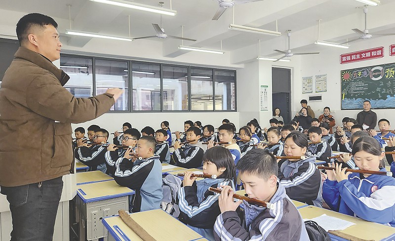 七年级2421班教室里,是另一番景象。班主任罗灵聪站在讲台上,打着节拍,指挥全班同学吹笛子。同学们吹奏的《龙洲之歌》节奏欢快,旋律明快,音律整齐。罗老师介绍,上学期开始,他引入中国传统乐器竹笛的教学,深受孩子们的喜爱。全班53个同学利用音乐课和课余时间,勤奋练习,已基本掌握吹奏竹笛的技巧,并学会识谱。