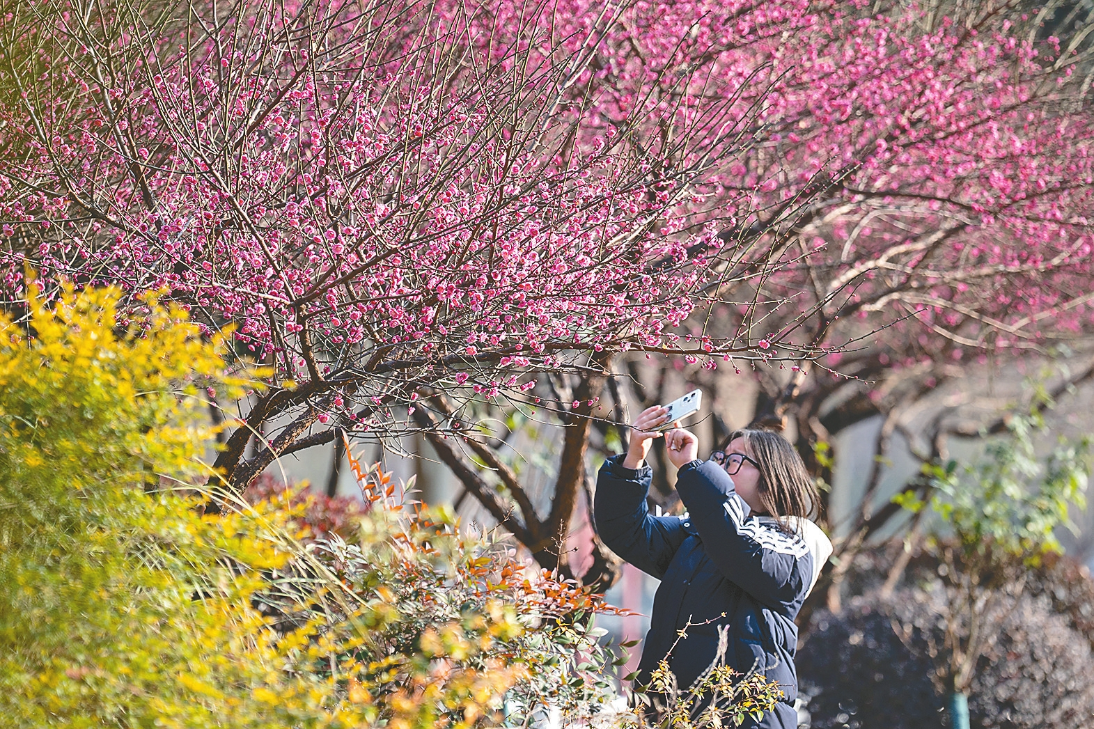 一园两中心内,暖阳遍洒,梅香与湖光相映成趣。这里不仅是健身休闲的热门地,更因梅花绽放,激发了暖冬经济的新活力。亲子家庭漫步花径,年轻人身着汉服打卡拍照,笑声与芬芳一同飘散。