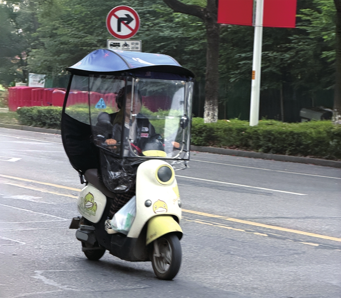 近日,记者在资阳区五一东路上看到,有市民驾驶的电动摩托车上加装了雨棚。加装雨棚会明显增加车身重量并提升高度,导致车辆在行驶中尤其是拥挤路段转弯时,与其他车辆或行人发生刮碰的风险显著增加,带来道路交通安全隐患。徐镜洋摄