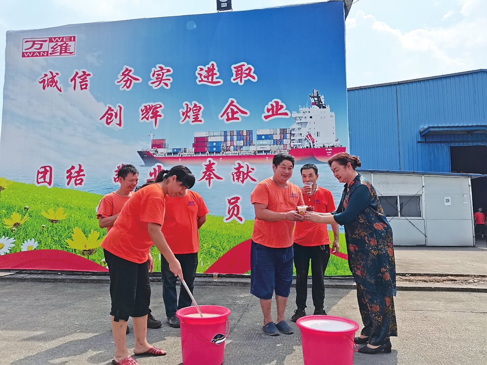 “沁甜的擂茶,大家赶紧过来喝……”7月15日,益阳桃花江竹业发展有限公司生产车间内,罗小卫热情招呼员工。炎炎夏日,她和家人打好擂茶送到车间,让忙碌的员工消暑解渴。