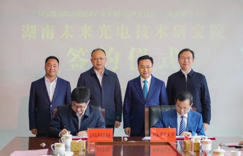 经过益阳高新区党工委、管委会高位推动、紧密接洽,今年3月初,湖南未来光电技术研究院正式签约。益阳高新区管委会与湖南师范大学双向奔赴,共建校地产学研合作联合创新平台。通过长沙、益阳双基地模式,充分发挥湖南师范大学学科和科研优势,深化未来光电技术领域的理论和应用基础研究;同时利用益阳高新区深厚产业土壤,大力开展技术服务、项目孵化,推动科研成果产业化落地,共同打造“湖南光电谷”。