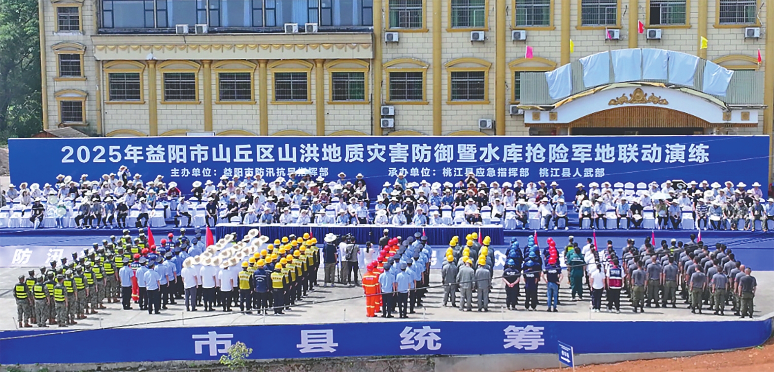 2025年益阳市山丘区山洪地质灾害防御暨水库抢险军地联动演练现场。