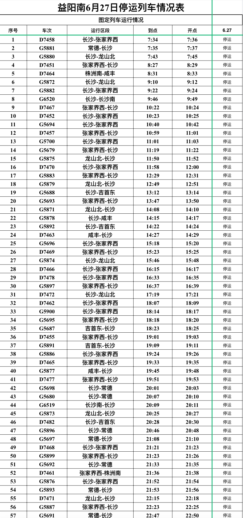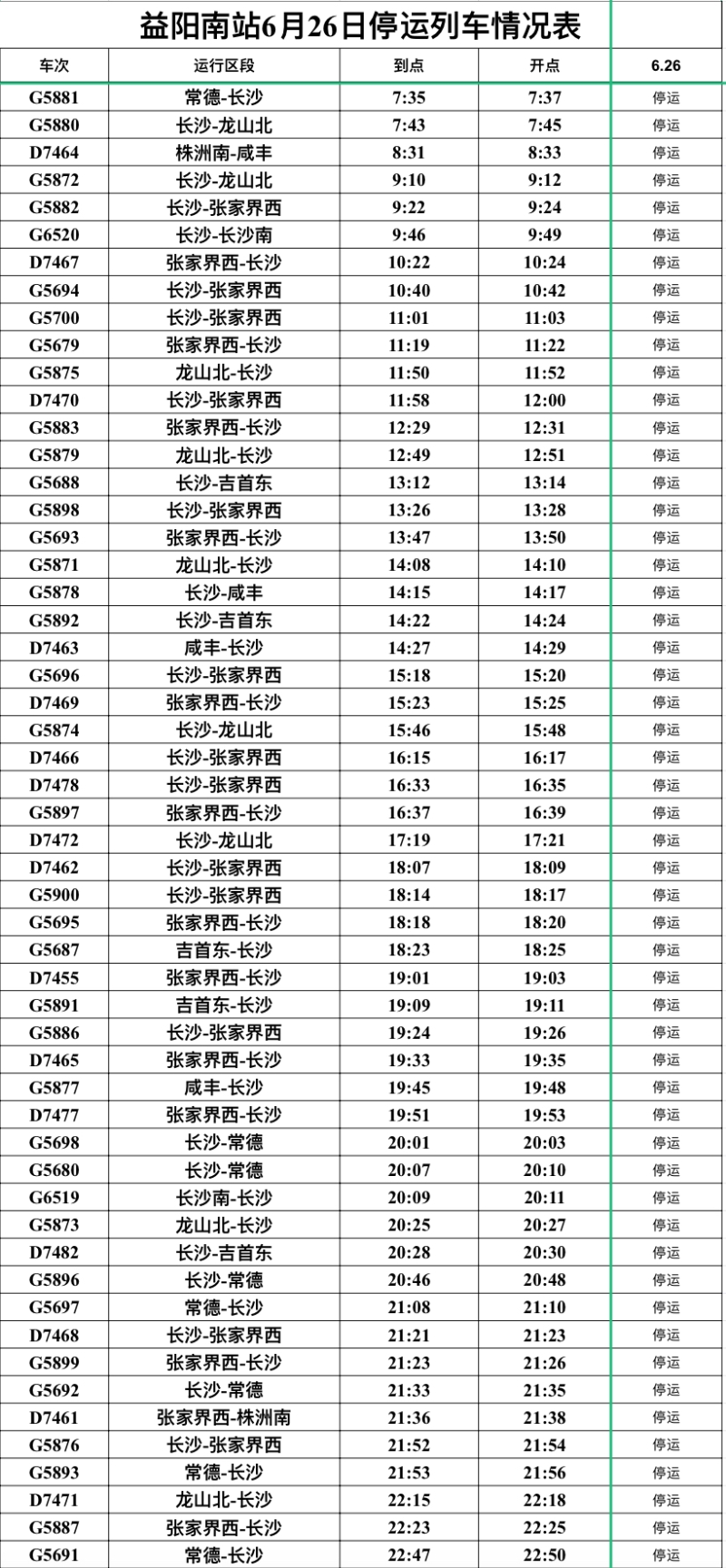 6月26日,记者从高铁益阳南站获悉,受湖南地区强降雨影响,为确保列车运行安全和旅客出行安全,长沙车务段益阳南站今明两日停运列车如下,结束营业时间改为18时30分。