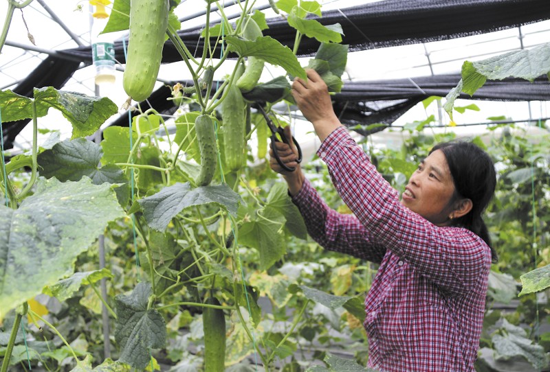 走进资阳区长春镇打伞树村的南方智能育秧(苗)中心,设施大棚内绿意盎然。一排排翠绿的黄瓜藤蔓攀爬在支架上,翠绿的黄瓜挂满枝头,散发着淡淡的清香。村民欧大姐和同伴们戴着遮阳帽,动作麻利地将成熟的黄瓜采摘下来,轻轻放入塑料筐中,再一袋袋整齐有序地码放在小三轮车上。“大棚除了黄瓜,还有茄子、西红柿、辣椒轮作不断,一年到头都有活。”欧大姐擦了擦额头的汗说,“在家门口就业,既能增收又能照看家里。”像她这样在基地务工的村民,旺季有20多人。“我们与盒马鲜生达成长期合作,从4月下旬到来年2月都能持续供应蔬菜,这种订单农业模式已经稳定运行了3年。”基地负责人龚丹介绍,基地建有100余亩智能联栋大棚和单拱大棚,依托水肥一体化智能灌溉系统精准调控环境,年产值可达300多万元。