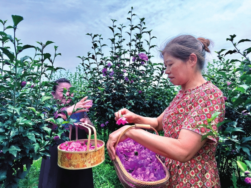 木槿花既能美化乡村颜值又能带动村民增收。图为村民采摘木槿花。陈徐文倩摄