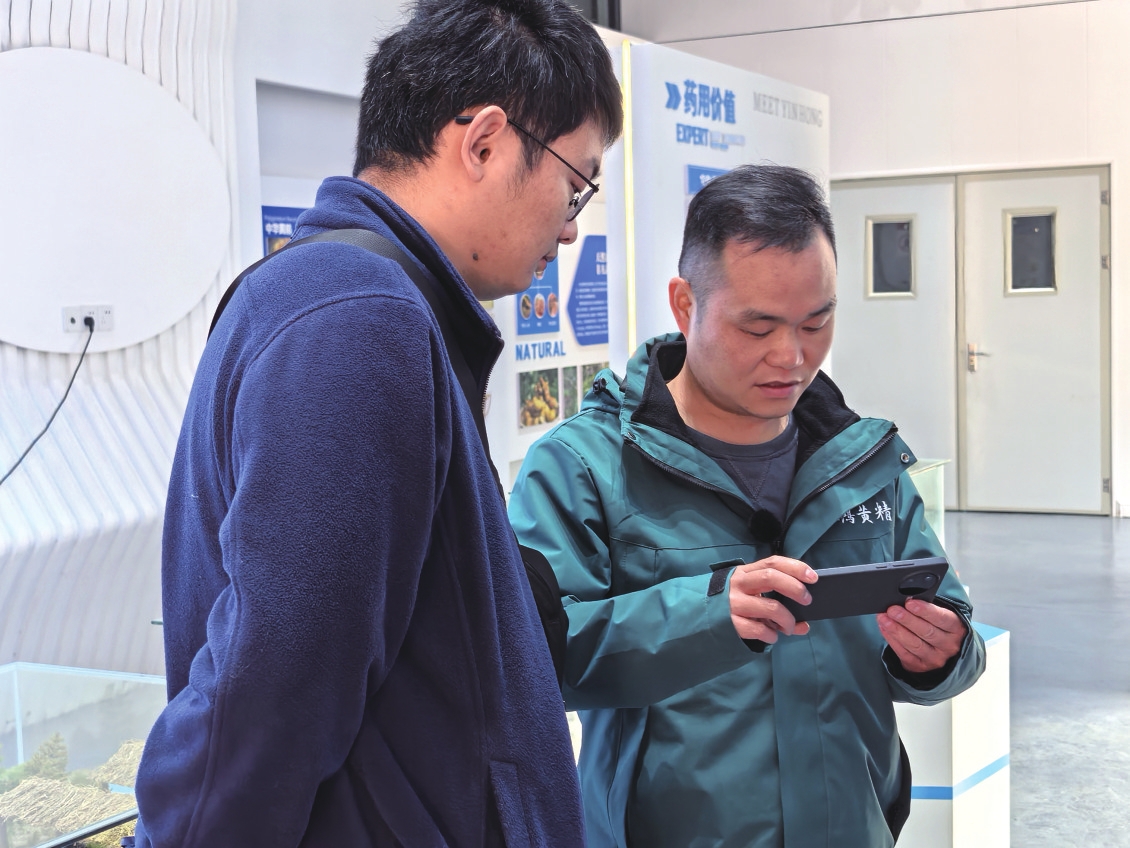 蒋双辉(右)关注公司黄精产品生产的每一个环节。陈浩军摄