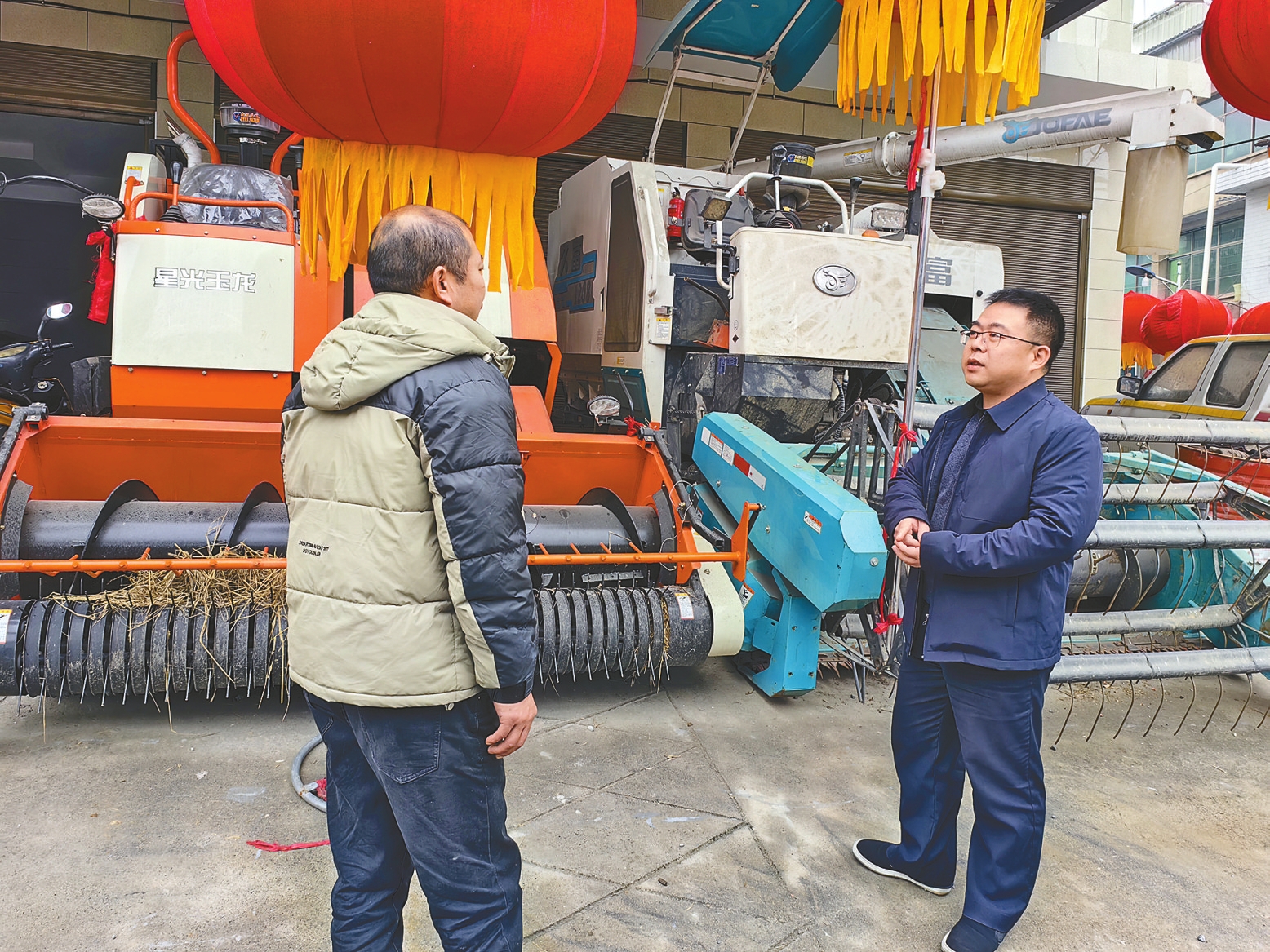 李政辉(右)向种粮大户了解秸秆回收、农机人才培育方面的情况。曹灿摄
