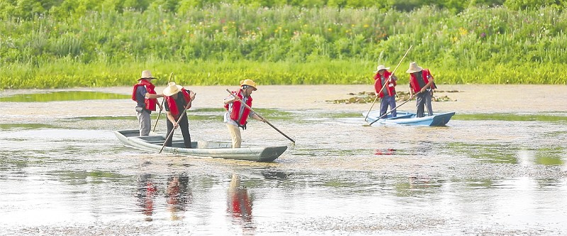 8月2日中午,水面温度很高,工作人员边和清驾着小船,对水生杂草进行打捞,不一会已汗流浃背。他说,隔两三天,他就要用刀片、耙子把杂草搂到船上,再从岸上运走。眼子菜、金鱼藻生长速度快,特别是眼子菜,在阳光的暴晒下,露出水面的草尖会泛白、枯死,污染水质,影响沉水植物生长。