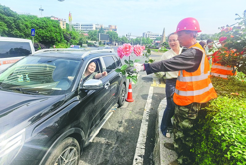 园林工人将修剪下来的鲜花和枝条送给路人。李娜摄