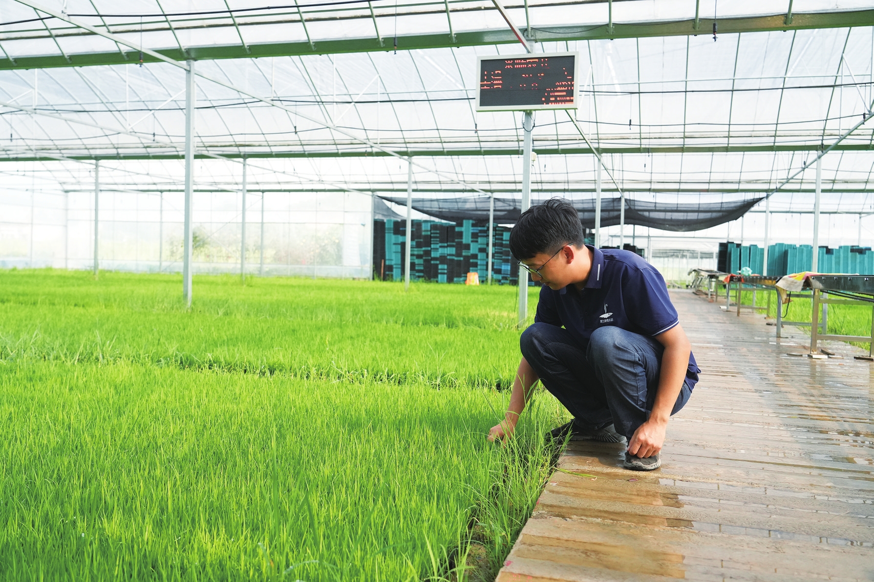 贺顺在育秧大棚查看秧苗长势。卢静摄