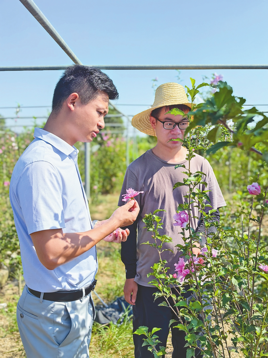 9月6日,资阳区长春镇先锋桥村木槿种植基地,花开正艳。张胜前笑着和在基地研学的中南林业大学学生打招呼:“这木槿结实率的问题,还得靠你们来解决。”
