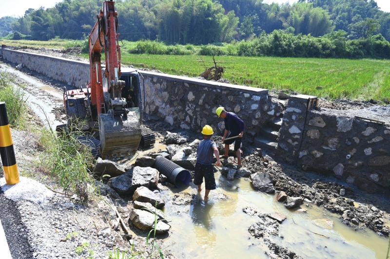 ▲工人对填方渠道险段进行除险加固。刘美玲摄