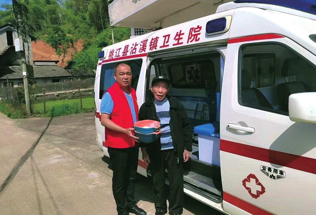 刘鹏(左)接送老年人参加体检。谢辉摄