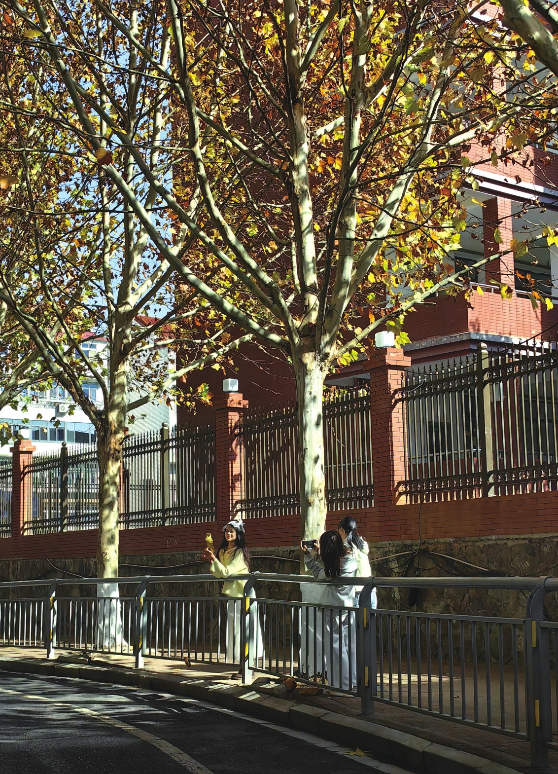 冬日阳光穿过层层叠叠的叶片洒落在地面,在斑驳的光影间,捡几片金黄的梧桐叶做道具,拍摄颇具氛围感的冬日大片。近期,位于中心城区大桃南路两旁成排的梧桐树披上了金黄色“盛装”,吸引了不少市民前来打卡。11月25日,阳光明媚,几名年轻人在梧桐树下拍照留念。