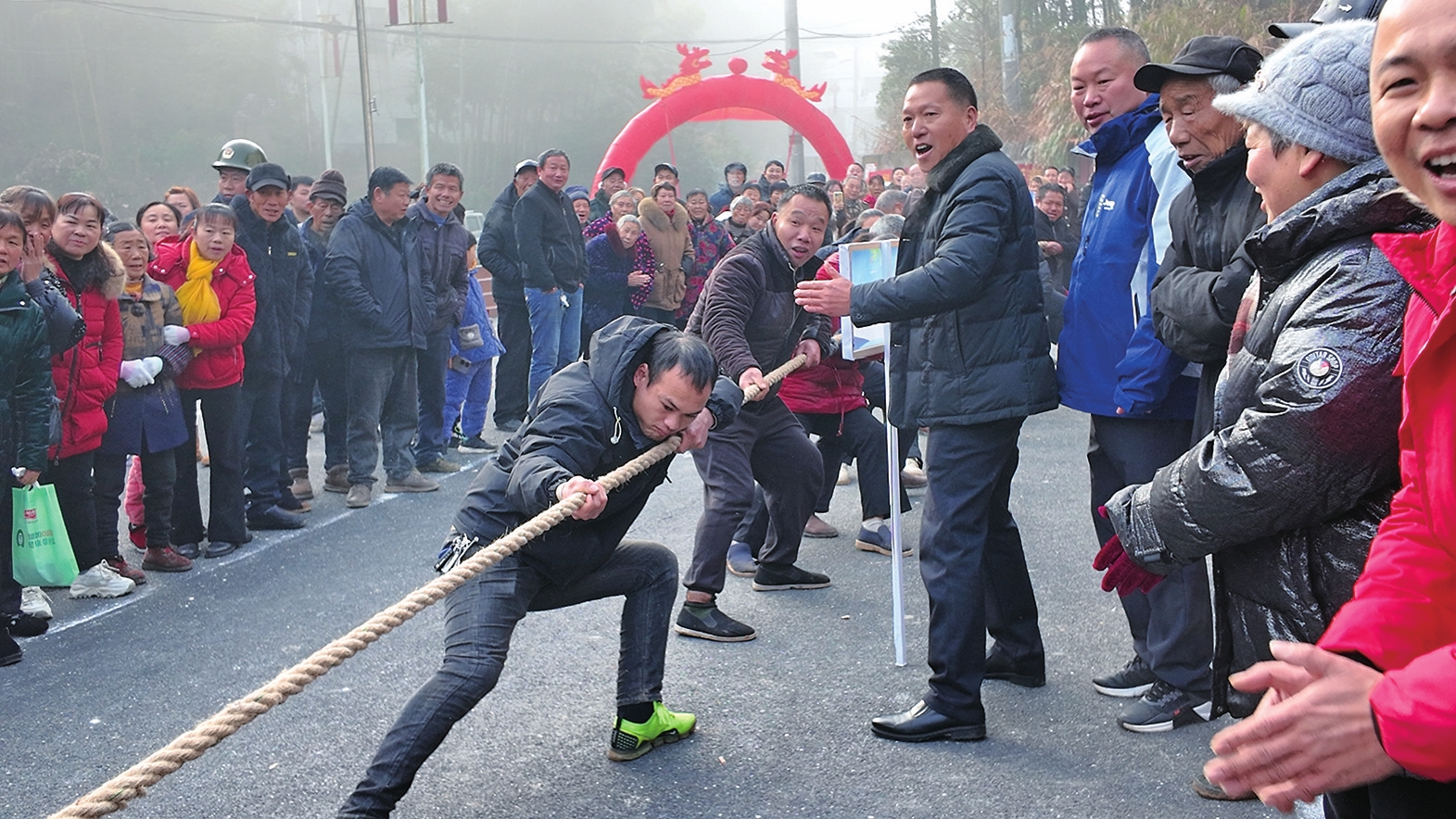 队员紧握长绳,观众呐喊助威,气氛热烈。陈徐文倩摄