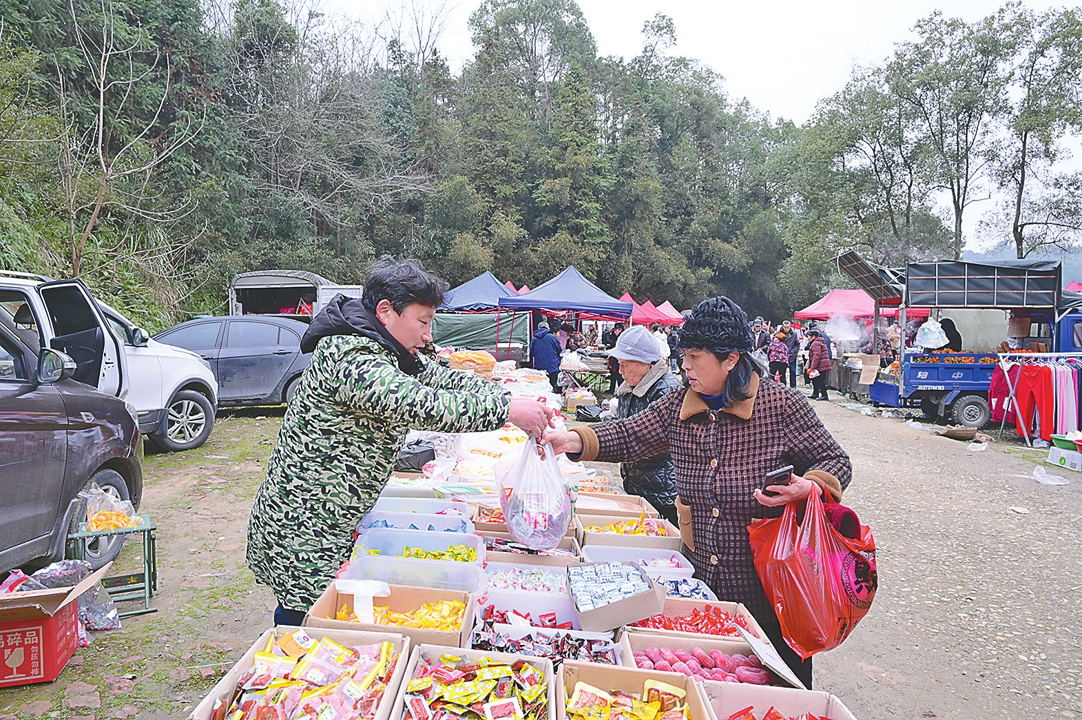 2月7日,桃江县浮邱山乡郭家湾屋场,村民在山脚下的年集上选购年货。这场已延续十余年的市集,汇聚了最朴素的年味与最浓厚的乡村烟火气。刘美玲摄